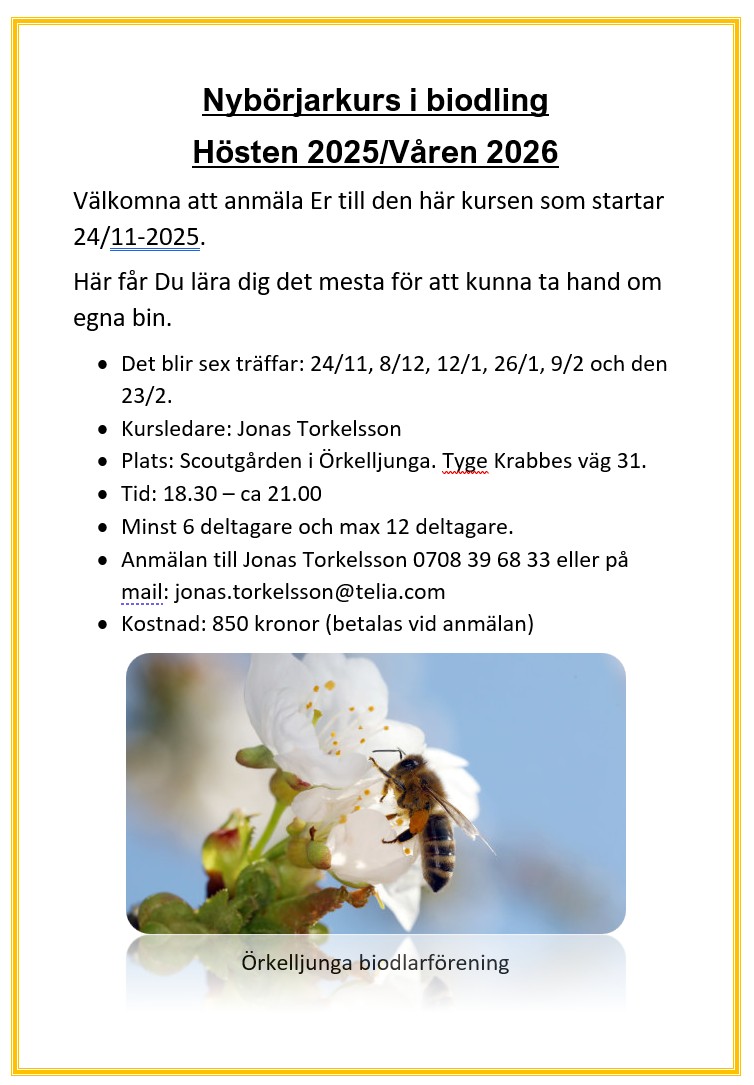 Startar under hösten 2025 en nybörjarkurs i biodling, mer info finns här eller på föreningens hemsida.